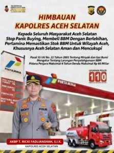 SALINDIA.ID – Aceh Selatan, Kapolres Aceh Selatan, AKBP T. Ricki Fadlianshah, S.I.K mengimbau masyarakat agar tidak melakukan panic buying BBM atau pembelian berlebihan terkait informasi