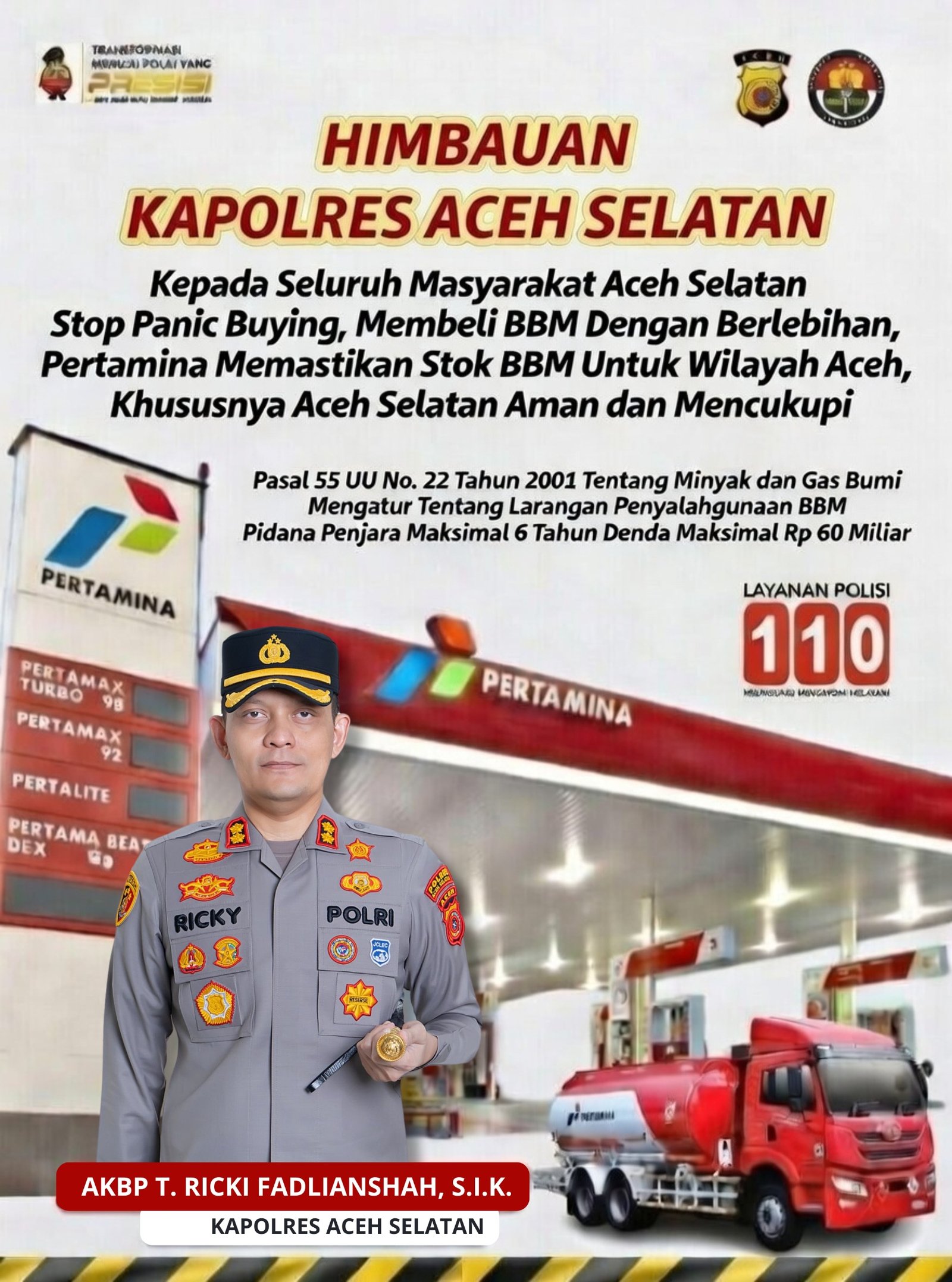 SALINDIA.ID - Aceh Selatan, Kapolres Aceh Selatan, AKBP T. Ricki Fadlianshah, S.I.K mengimbau masyarakat agar tidak melakukan panic buying BBM...